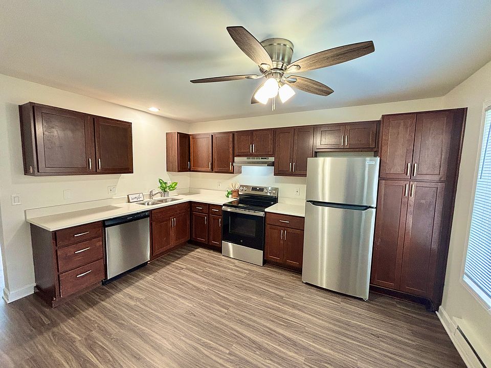 Stainless-steel appliances like a dishwasher, refrigerator/freezer