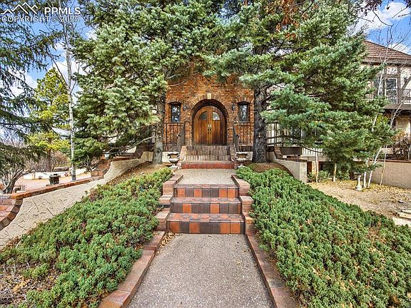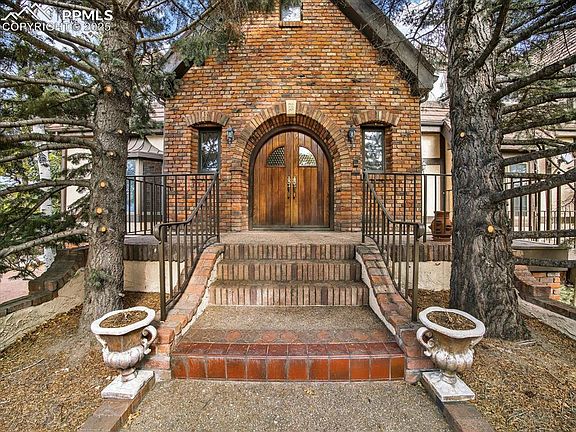 Beautiful custom Tudor-inspired home on over a half-acre lot in Monument. This spectacular move-in ready residence is brimming with luxurious details. Striking entry w/custom wood double arched entry doors lead into a spectacular two-story, cathedral ceiling living room (25x34). Hickory floors, hand-hewn beams with a grand staircase and interior balcony. The attractive fireplace extends the expanse of the two-story ceiling, complemented by built-ins and a custom mantle. A convenient wet bar is positioned off the living room. A gorgeous formal dining room boasts another fireplace, built-in cabinetry, and two charming bay-windows/window-seats with mountain views. Spacious Gourmet Kitchen (18x20) With Travertine flooring, live-edge finish/premium granite counters and a center island with a range and modern stainless-steel hood. Double-ovens, built-in refrigerator, and ample custom cabinetry and walk-in pantry. A beautiful wall of French doors leads to a balcony off the kitchen. Extra-large laundry room with abundant storage space. Two over-sized main level bedrooms share a convenient Jack-and-Jill bath and Jack-and-Jill closet. One wing of the upper level is dedicated to a sprawling 800 sq ft Primary Suite, featuring a fireplace with a Terrazzo hearth and mantel and French doors opening to another private balcony. The luxurious primary bathroom includes a jetted tub, shower, and two walk-in closets. An additional non-conforming bedroom upstairs with cathedral ceiling. The garden-level basement features a large family room and tons of storage space. Brick exterior accents, a circular driveway and naturally landscaped grounds include a beautiful waterfall feature. A fully finished and heated woodworking shop with a 9-foot door is great for hobbyists or extra storage. Attached three-car garage. This home is a masterpiece of design, offering an unparalleled level of detail and luxury. If you can think of a special feature, this home probably has it!