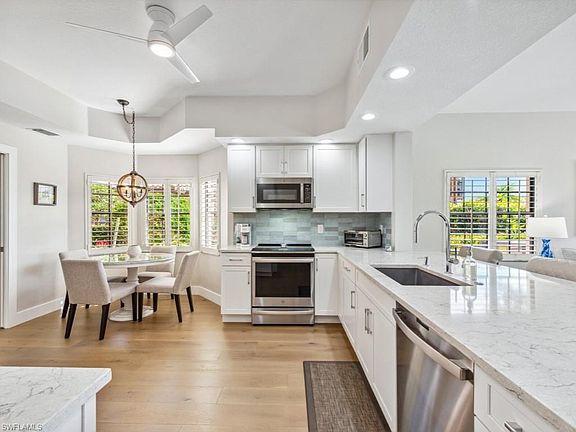 C14102 - Beautifully updated first-floor end-unit condo home, featuring a two-car attached garage, and a new roof! From the moment you enter, you’ll note the modern clean look of this highly desirable property. There is engineered hard wood flooring throughout, and porcelain tile in wet areas. The kitchen is white and bright, boasting GE Profile stainless steel appliances, quartz counter tops, and a large walk-in pantry. Plantation shutters on all windows. The primary bathroom has been completely renovated, including new cabinetry, shower, and quartz counters. The owners closet offers convenient custom shelving. Completely renovated guest bath. From the South facing lanai, there is a private golf, lake, double fountain and preserve view. The unit has a unique, large storage closet next to the garage which is extremely handy. Grande Reserve offers ample guest parking. Several of which are directly across from the property. Enjoy a friendly, active country club lifestyle, complete with three beautifully maintained 9 hole golf courses, tennis, pickleball, fitness center, and an impressive Jr. Olympic pool with lap lanes. There are newer bocce courts, as well as a recently added croquet center and Island bar, and Tavern 59 for residents to enjoy. All of this is located within short drive of many dining and shopping conveniences, Seed To Table grocery store, and the famous sugar-sand Naples beaches on the Gulf.