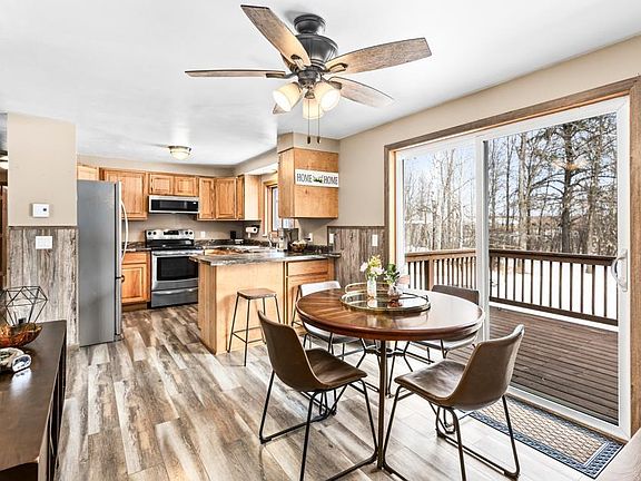 Close country living! Upon entering, you are greeted by a convenient side entry featuring main-floor laundry facilities with a newer washer and dryer, as well as an entry closet. The main floor includes the kitchen, complete with all new appliances, a breakfast bar, and a pantry closet, the dining room with a patio door leading to a deck, perfect for enjoying the sunshine, an inviting living room, characterized by vaulted ceilings and a cozy gas fireplace. Accompanying the living space on the main floor are a full bathroom and three bedrooms, one of which features a desirable walk-in closet. The basement unveils additional living space, including a generously sized family room with another gas fireplace, ideal for movie nights or recreational activities. There is a 4th bedroom in the basement with no egress. Additionally, there is a den and an abundance of storage space. Some updates include a new roof on the house and garage, fresh fascia and gutters, new millwork, deck boards, digital thermostats and carpet. Outdoor enthusiasts will appreciate the expansive yard, featuring a volleyball court, and patios. Don't miss your chance to call this remarkable property home. Schedule your showing today!