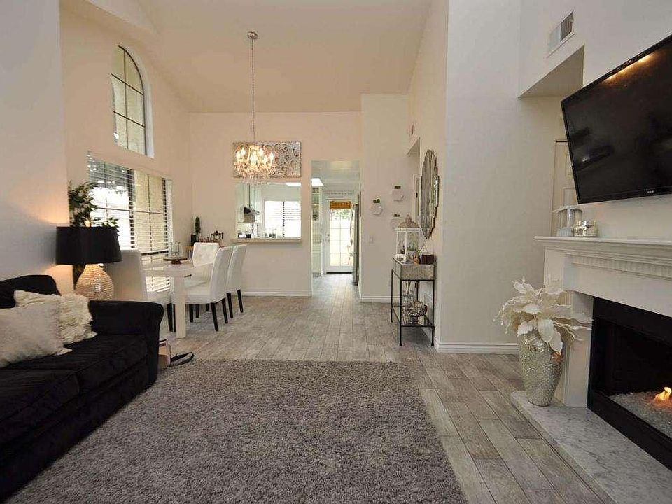 Rare one story Restoration Hardware-styled end unit town home! Wow, gorgeous! Stunning gray wood-like tile floors; hip bright white walls, tall baseboards and stainless appliances! The crystal and nickel chandelier is stunning as is the new marble fireplace with glass. Privacy abounds. This 2 bedroom, 2 bath home has no steps and just one neighbor! No neighbor behind, above or to the SW side the side. It's so bright! The towering great room windows flood the home in natural light. 2 year new A/C and furnace too! The community is close to all shopping and is a short walk to the gorgeous Mission Oaks Community Park Trail with the creek and tree-canopy covered trail. Association amenities include lovely manicured grounds, a pool and spa and the exteriors were recently painted.