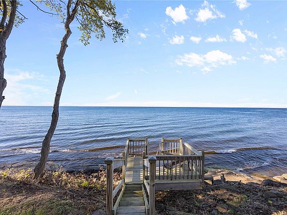 Paradise found! Impeccable in and out! Spectacular prime waterfront property with 168' of Lake Ontario frontage. Panoramic lake views. Staircace leads to a deck landing then down to the lake level. Magnificent lake views from the great room, kitchen and primary bedroom. The great room has 11' ceilings, gas fireplace and hardwood floors and crown moldings. Large screened covered porch overlooking the waterfront. The kitchen was recently remodeled with French vanilla cabinets, custom pantry cabinet and quartz countertop with vinyl plank floor. All appliances are included. Spacious lower level with wood burning stove and siding doors that lead to the large paito area great for added entertaining. This property is spotless and move in ready! Enjoy beautiful sunsets and lakefront living here on 5751 Sodus Shores!**Delayed negotiation on Monday, 10/27 at noon.