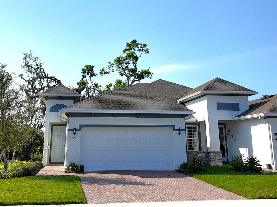 This desirable 3 Bed/2 bath/2 car garage villa in beautiful gated Trevesta is conveniently located near I-75 and US-301, between St. Petersburg and Siesta Key. Owner pays for HOA, landscaping, maintenance, pest control, cable and internet. Amenities include community center, luxurious pool with splash pad, fully equipped fitness center, and kids playground. Home features Brick-paved driveway and entry to digital keyless front door. Open concept home with soaring 9' ceilings and enclosed lanai. All appliances less than 5 years old with new fans in bedrooms and lanai. Primary suite features tray ceilings, a walk-in closet, dual sinks, private powder room, rainfall shower over penny tile, and sunset views. View is of private, protected land, with no rear neighbors. Welcome home to this dog-friendly and neighborly community! $50 fee per applicant for screening.