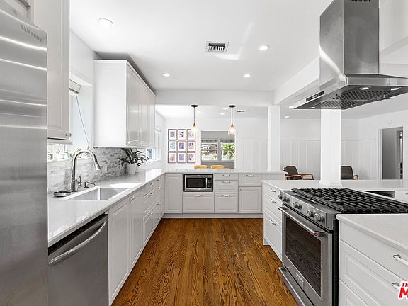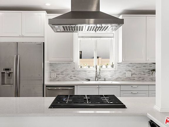 Welcome to this beautifully updated home, featuring timeless finishes throughout. The spacious living room boasts a coved ceiling, a white brick fireplace, and hardwood floors. This thoughtfully reimagined open floor plan includes a remodeled kitchen, dining area, family room, and an entertainer's bar. The kitchen showcases sophisticated elements such as quartz countertops, custom backsplashes, white cabinetry, and stainless steel appliances. Ample counter space surrounds a 5-burner KitchenAid stove with a stainless steel hood, and the washer and dryer are seamlessly integrated behind cabinetry. The family room and bar area open to a stunning backyard oasis with a beautiful pool, enhanced by landscape lighting, bistro lights, a TV hookup, and a cozy outdoor living area perfect for California living. Relax by the large pool & enjoy movies outside on the patio. This home also features an oversized garage that could be perfect for an ADU or a giant bonus space/office. The primary features a bay window seat and a big closet, while the kids' room offers an oversized closet with mirrored doors. A charming full bath includes beadboard accents, a subway-tiled shower, a custom marble vanity with double sinks, and an elegant clawfoot tub. The updated second bath also features a beadboard and stylish tiled shower and flooring. The backyard features a sparkling pool, fruit trees, and a converted space with drywall rendering, making it an ideal art studio, home office, or children's play area. Located in the award-winning Kester Avenue Elementary School district. Don't miss out on this special property!
