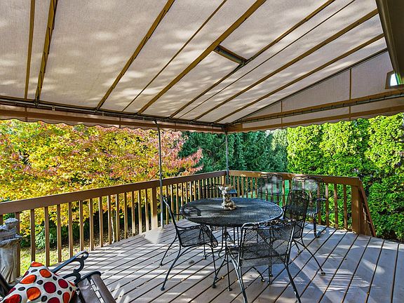 Enjoy a large, vaulted living room that flows into the dining area, complete with a cozy gas fireplace and 9-foot glass doors opening to a raised deck with a new awning - perfect for relaxing or entertaining outdoors. Multiple skylights and large windows flood the home with sunlight.