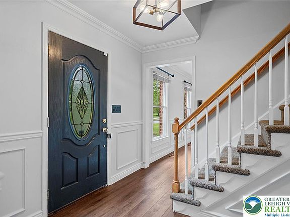 4-Bedroom, 2.5-bathroom Colonial home in the picturesque Woodland Estates, Nazareth PA. Step inside, and you'll be greeted by oak floors adorned with exquisite Brazilian cherry accents, custom-built cabinets that provide both functionality and style, and a stunning marble electric fireplace that sets the tone for warmth and sophistication. The graceful French doors seamlessly connect the formal sitting and living rooms, creating an inviting flow throughout the home. The heart of this home is the recently remodeled kitchen, where culinary dreams come to life. Equipped with a stainless steel WOLF gas range and hood, this kitchen is a haven for any home chef. The open dining area, complete with a generously sized bay window, offers the perfect setting for dining with a moonlit view. The living room is an oasis of relaxation, featuring sliding doors that lead to a spacious deck and a charming gazebo. This outdoor space invites you to enjoy quiet summer evenings or host memorable get-togethers. The Master bedroom is a retreat in itself, boasting vaulted ceilings with two skylights that flood the room with natural light. Unwind in the master bathroom, which features elegant marble floors and a soothing jetted tub, providing the perfect place to relax and rejuvenate. All of this is discreetly nestled on a substantial 3/4 acre lot, offering privacy and space for outdoor enjoyment! Highest and Best by Friday 6/20 at 10 a.m