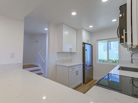 This beautifully remodeled end-unit townhome you want to call home. Everything has been redone: new windows, cabinets, sinks, tub, angle stops, etc. The spacious layout includes three bedrooms with vaulted ceilings and 1.5 baths. The home features vinyl flooring on the first floor and refinished original hardwood upstairs. Located in the quiet, tucked-away community of UTC, this townhome offers plenty of parking and access to fun amenities, including tennis courts, a pool, a spa, and a playground. Enjoy the privacy of an end unit with no neighbors above and lovely canyon views (because it's an end unit). Additional highlights include a private patio, both in-unit and community laundry options, two assigned tandem parking spaces, and extra storage above covered parking space. Conveniently situated near Interstate 805 and Highway 52, this home is perfect for those seeking both comfort and accessibility. FYI: mirrored closet doors will be installed next week