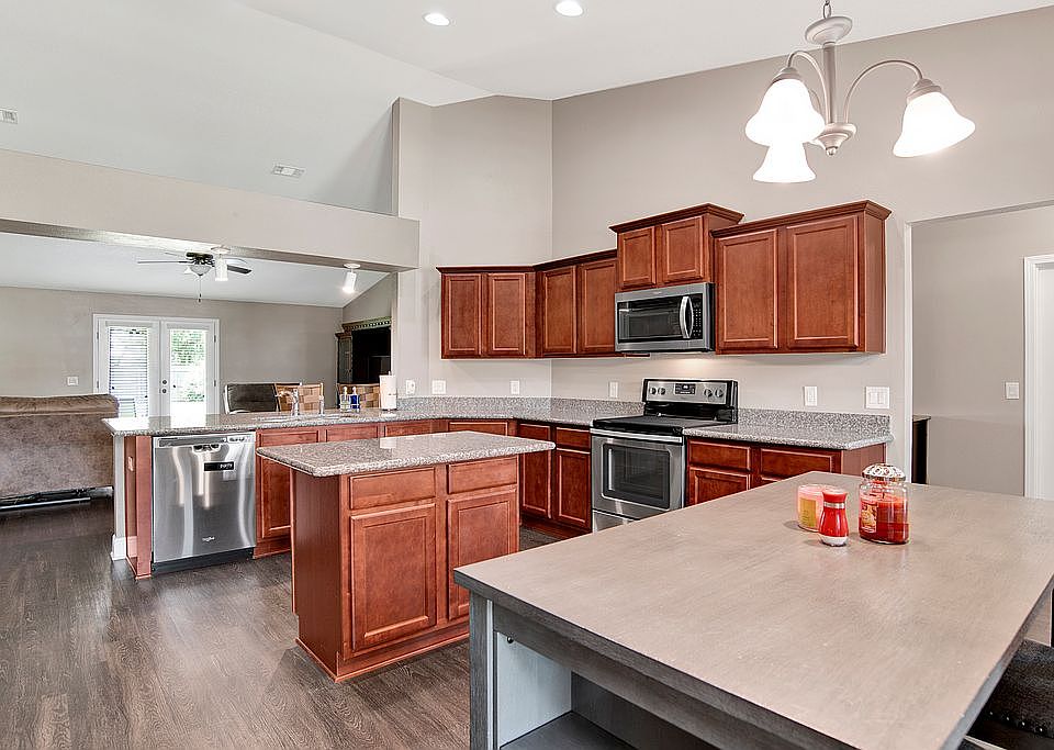 Large pantryLarge backyardOversized master-bathVaulted ceilingsGarden tubWood laminate flooringAmple cabinet space