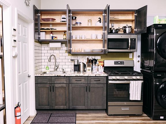 - FULL KITCHEN STOCKED WITH ALL ESSENTIALS, FROM COFFEE TO COOKWARE