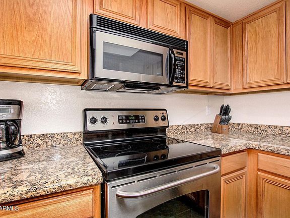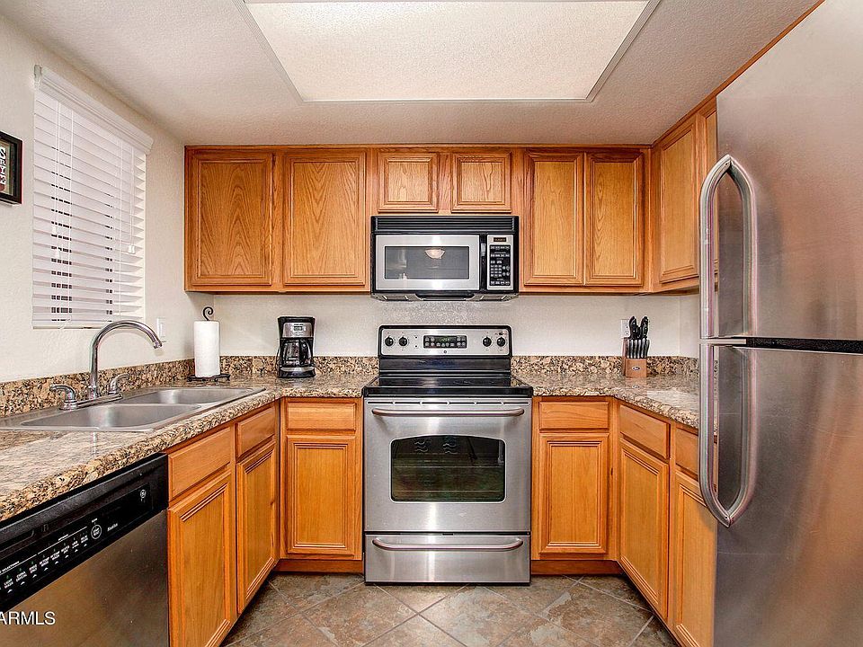 ***WOW*** Upgraded, very well maintained 2 bedroom END UNIT with great views! This home is perfect for a winter getaway, working professionals or a small family! The home boasts a chef's gourmet kitchen with GRANITE countertops, STAINLESS STEEL appliances, and upgraded cabinets. Custom diagonal lay tile, vaulted ceilings, custom decorator paint, & 2 private balconies with great views! Large master walk-in closet with built-in organizer system. Comes with FRIDGE, WASHER, & DRYER! Home includes 2 covered parking spaces. Community amenities including sparkling pool, built in BBQs, and a rec center with fireplace, TV, and kitchen facilities. GREAT location-walking distance from Thunderbird Paseo park, playground, and disc golf course. Close to Banner Thunderbird hospital & ASU West.