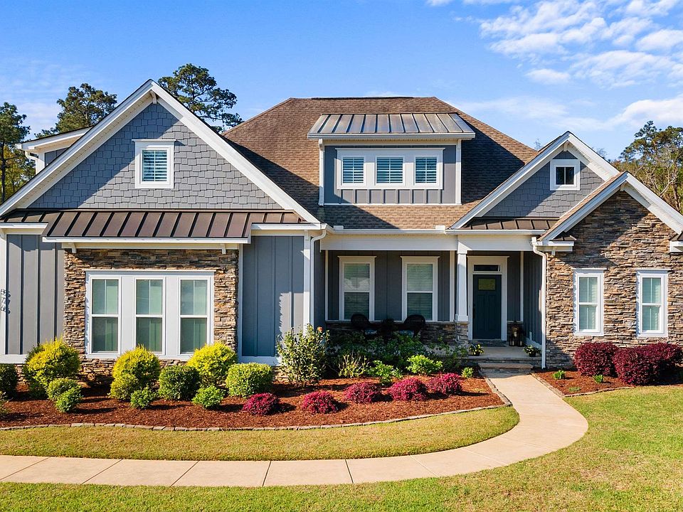 Beautiful Cypress River Plantation Custom-Built home on large private lot with 5 bedrooms and 3.5 baths. Lot has natural wetlands/preserve area at back which hosts an array of beautiful birds you can enjoy from your screened-in porch. Sellers added black aluminum fencing and had landscaping professionally designed and installed including Belgium block (2020) and also re-stained deck (2024). Board & Batten siding is cement fiber board with shaker-style shingles and decorative stacked stone veneer plus wide front porch. The elegant foyer with chandelier and engineered hardwood flooring invites you into the sunny living room complete with wood-burning fireplace. Freshly painted (2024). Enjoy crown moldings, tray ceilings, and plantation shutters throughout. Chef-style kitchen has high shaker cabinetry, stainless steel appliances, granite countertops, large center island is great for entertaining plus HUGE upgraded pantry and laundry room (2024). The first floor boasts TWO bedrooms and two full baths along with a powder room for guests. The sellers added California Closets (2021) to what had been an office on the 1st floor creating a new bedroom. Nearby full bath recently painted (2024) and upgraded mirror and cabinet (2024) added. The engineered hardwood flooring continues into the 1st floor spacious primary suite which includes tray ceiling with crown moldings, plantation shutters and ceiling fan. Primary bath has ceramic tile floor and shower walls plus garden tub and two separate vanities with new mirrors (2024). Large walk-in closet includes new custom closet elements (2024). Second floor bedrooms all have ceiling fans and California Closets were added to large bonus/bedroom (2020). Cypress River Plantation has a 24/7 manned gate. Amenities include a large community pool, fitness center and clubhouse, tennis/pickleball courts, basketball court, and a kids play area plus a private boat landing with day dock and boat/trailer storage with easy access to the Intracoastal Waterway. This house has everything you could want in your new home. All measurements are approximate. Buyer is responsible for verification of square footage and HOA details.