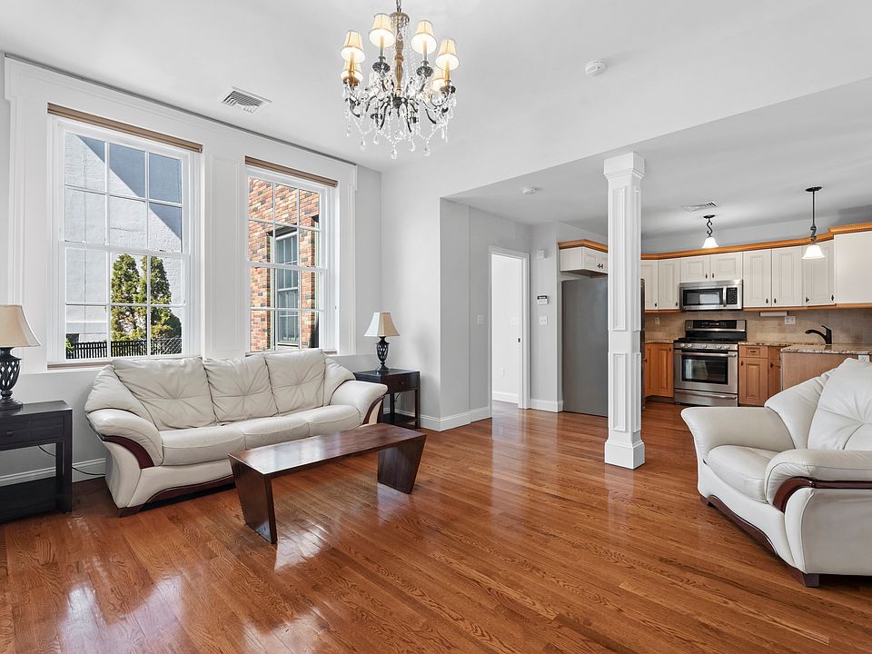 Sparkling clean laundry roomSleek breakfast barElegant granite countertopsBike roomLarge primary bedroomPristine hardwood floorsAdjacent eat-in kitchen