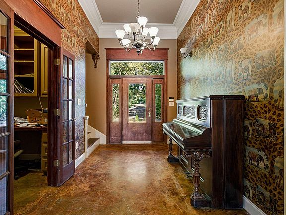 Welcome to this spacious home nestled on 3 acres featuring a circle driveway, brick paver entryway, and stately exposed columns. Multiple entry points provide convenient access, with the main entrance leading into a welcoming foyer. Just off the foyer is a dedicated office with built-in desk and cabinetry. The living room showcases soaring ceilings, a grand encased fireplace, and custom built-ins, creating a warm and inviting centerpiece for the home. To the right, the primary suite offers backyard access, built-ins, and an en-suite bath complete with double vanities, a large soaking tub, separate tiled shower, and a massive walk-in closet. Through the primary bath, you’ll find a spacious laundry room featuring a utility sink, folding area, built-in ironing board, abundant cabinetry, and a secondary exterior door leading to the front porch. Off the laundry hall is a full bath and a large bedroom that connects back to the main living area. The kitchen offers granite countertops, a gas cooktop, extensive cabinetry, and a raised bar for additional seating. A designated dining area opens to the backyard, and the screened-in outdoor kitchen provides the perfect setup for entertaining. Convenient access to the two-car garage is located just off the kitchen. Upstairs, a versatile layout includes a bedroom with laminate flooring, walk-in closet, and full bath with tub/shower combo. Across the landing is a large game or recreation room with tile flooring, long bar with double sink, and ample cabinet storage. Beyond the game room, another bedroom features built-ins, a walk-in closet, recessed alcoves, and an additional full bath. The upper level also includes washer/dryer hookups, locked storage space, and thoughtful built-in organization throughout. This property blends function and charm with its multiple living spaces, abundant storage, and scenic acreage—offering comfort and flexibility both inside and out.