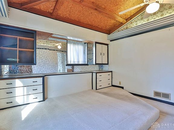 Brick ranchWood beamed vaulted ceilingCeiling fanFront porchBuilt-in shelvesStudy off kitchenRaised platform for bed
