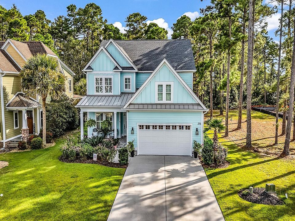 Welcome to this exquisite 4 bedroom, 4.5 bathroom custom-built home located in Phase 1 of the highly sought-after Waterbridge community of Myrtle Beach SC. From the moment you enter through the herringbone-patterned foyer, the attention to detail is undeniable with crown molding flows throughout the home, complemented by elegant plantation shutters that add timeless style. The expansive open living area is anchored by a dramatic double tray ceiling and a cozy fireplace, creating a warm and sophisticated gathering space. The gourmet kitchen is a chef’s dream, featuring a smart double oven, a large center island, Blanco sink, walk-in pantry, and quartz countertops throughout. The Owner’s suite boasts an oversized walk-in closet, hallway, double vanity along with a fully tiled walk in shower. There is also two walk in tiled showers throughout the home. Additional highlights include a dedicated office, a spacious upstairs loft with two bedrooms and two full bathrooms, and a front room over the garage—perfect for storage or flex space. Outdoors, enjoy a remarkable screened-in back porch complete with a Napoleon grill and sink. The lot provides privacy and serenity, backing up to beautiful trees for a peaceful setting. Flooring includes durable ceramic tile on the main level and rich engineered oak hardwood upstairs, combining luxury with practicality. The home also features a 2-car garage with an additional slot for a golf cart or workshop, offering plenty of space for both vehicles and hobbies. Living in Waterbridge means you’ll also enjoy world-class community amenities, including a resort-style pool, clubhouse, fitness center, tennis and volleyball courts, fire pits, and boat storage with access to the community lake. With unmatched craftsmanship, thoughtful design, and an amenity-rich community, this home delivers the perfect blend of luxury and Lowcountry charm.