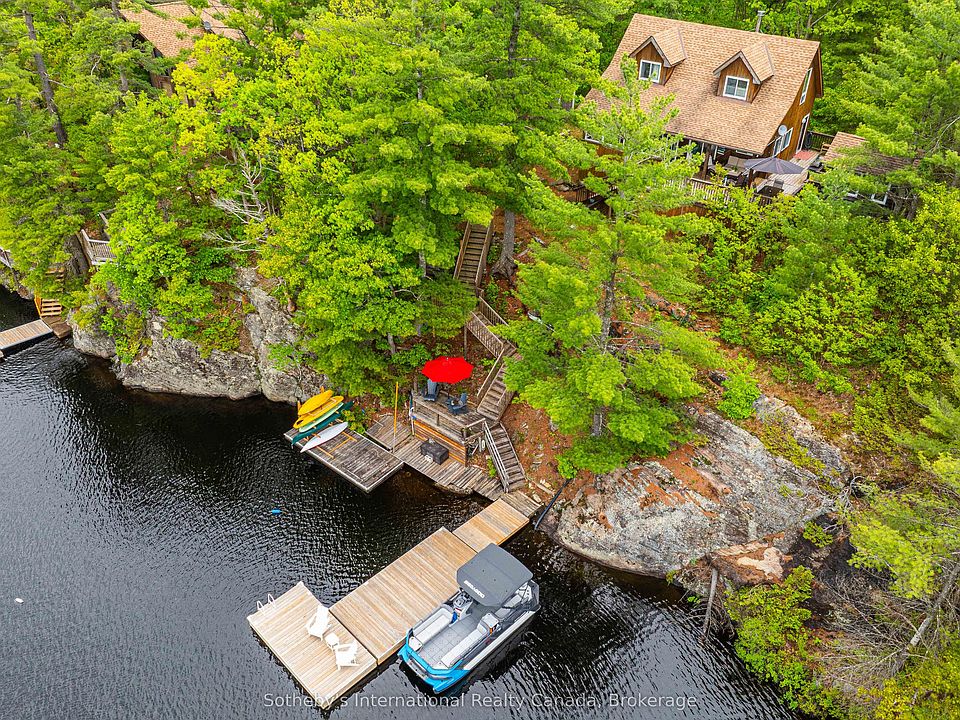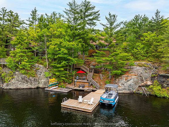 This beautifully updated 2-bedroom + loft, 2-bathroom cottage is an incredible offering in the highly desirable and peaceful Grants Bay on Kahshe Lake, just a short 5-minute boat ride from the marina with a Princecraft pontoon boat included! Set on a private half-acre lot with 110 feet of pristine shoreline, this property offers the perfect blend of cottage charm and modern comfort. The open-concept living space features soaring vaulted ceilings, a cozy woodstove, and expansive windows that fill the cottage with natural light and showcase stunning elevated views of the lake. Western exposure ensures all-day sun and unforgettable sunsets, while the surrounding mature white pines provide exceptional privacy and a true escape into nature. A bright sunroom dining area and spacious red cedar deck are perfect for entertaining or relaxing with family and friends. Near the waters edge, a new large dock and additional sun deck create the ultimate spot for swimming, lounging, or enjoying the peaceful sounds of the lake. The primary bedroom on the upper level includes a brand new 2-piece ensuite bathroom, and additional sleeping space is available in the cozy loft and separate lakeside bunkie. With tasteful updates throughout, including modern flooring, fresh paint, stainless steel appliances, and thoughtful finishes, this turnkey, boat-access-only cottage is ready for you to move in and start making summer memories on one of Muskoka's most cherished lakes.
