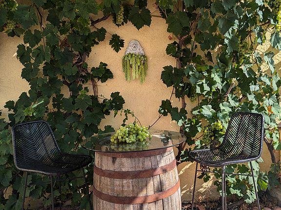 Additional outdoor living spaces include 2 large patios and a natural, healthy bermuda grass lawn with mature plants and manicured landscaping, as pictured. Mediterranean vibes abound with red geraniums, olive tree and grape vines provide natural shading over the pergola (seasonal). Flanked with privacy fencing on all sides and lush greenery. Property faces an open lot/hillside. Just steps from the home is an unexpected skyline picturesque view of San Diego, Point Loma and the Coronado Bridge.