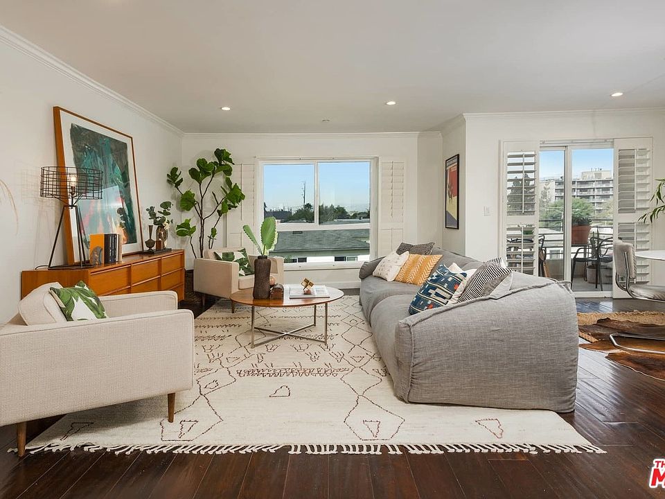 Bright, spacious, peaceful corner unit offering a wide range of pleasant views from every room. This fully modernized 2 + 2 home features an open floor plan, a large master suite with a deep walk-in closet for a couple. There is an open kitchen to the dining area, private patio, in unit laundry and central A/C. New Interior features include high-end wide plank flooring, new recessed lighting, upgraded master bath, upgraded kitchen, dining room and living room. New dual pane windows, new wool carpeting. All kitchen appliances have been replaced to Bosch and LG. Building amenities include a community room, common area patio with rock garden, 2 assigned parking spaces in garage plus 3 guest spots. Located in close proximity to the Purple Metro Line, Original Farmers Market & The Grove, Whole Foods, parks, 3rd St and museums. Easy access to Beverly Hills, Koreatown and Downtown.