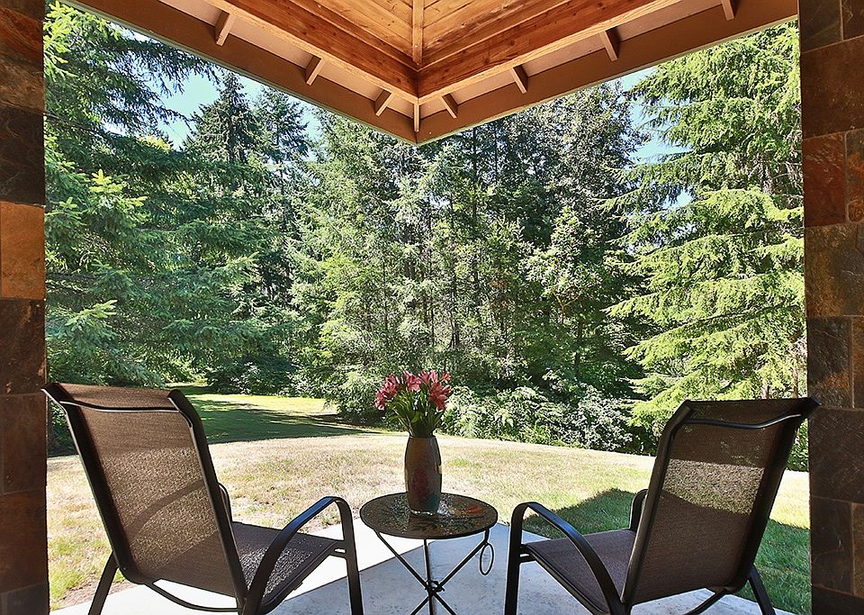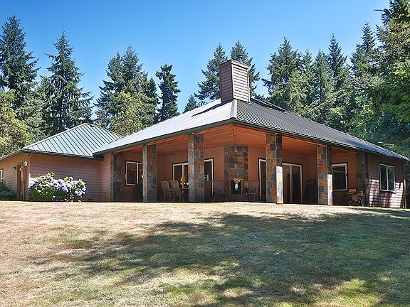 Extraordinary NW home situated on 5 acres with trails throughout. Encompassed by Dogwood, Madrona, Cedars & Fir trees with lovely roses, dahlias & enclosed gardens. A grand entrance w/ 22' ceilings, acid stained concrete, & crab inlay. Kitchen features concrete counters w/crushed wine glass, slate & sit-up kitchen counter w/pendant lighting. 10' T&G covered patio for entertaining w/slate wood burning fireplace. Private and tranquil. Workspace in the garage. Close to downtown Langley & ferry.