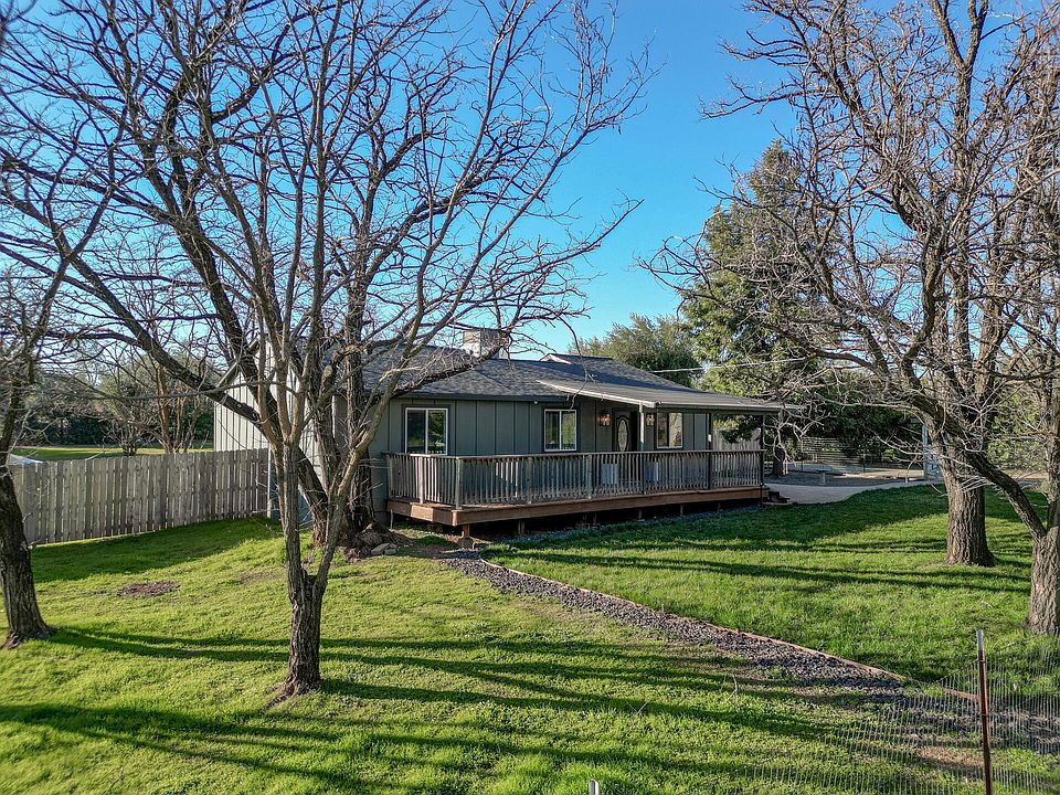 Discover this charming 3-bedroom, 2-bath home nestled on 2.39 picturesque acres. Enjoy relaxing on the adorable covered front porch while taking in the peaceful surroundings. This property is perfect for horse lovers, featuring a shelter and outbuildings. Recent upgrades include a brand-new roof, newer HVAC system, and windows. The bathrooms have been completely remodeled with modern finishes. You'll love the mature olive trees, scenic pond, and ample space for RV or boat parking. With plenty of room for outdoor entertaining, this is a rare opportunity you don't want to miss!