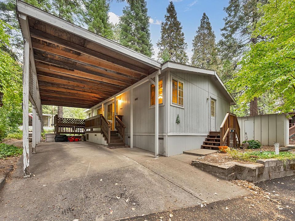 Tucked among the beautiful, mature trees of a highly sought-after 55+ Community in Pollock Pines, this charming double-wide offers comfort, convenience, and endless potential. The thoughtful floor plan provides a spacious and functional layout, while large windows bring in plenty of natural light and peaceful views of the surrounding greenery. With just some fresh paint and vision, this home could easily become the darling retreat you've been dreaming of. Enjoy relaxing on the covered front porch, keep your car sheltered under the covered parking area, and take advantage of the handy storage shed for your tools or hobbies. Located near local shops, restaurants, and public transportation, everything you need is close at hand. For those who love the outdoors, Pollock Pines offers endless opportunities for recreation from nearby lakes and hiking trails to fishing, boating and exploring the beauty of the surrounding area. Whether you're looking for a peaceful weekend getaway, a relaxing retirement spot, or a place to plant permanent roots, this home has all the right ingredients to make it your own. Space rent is $675/ month - includes garbage and sewer.