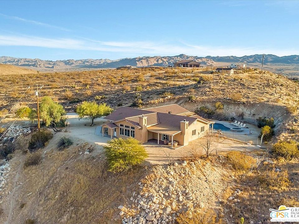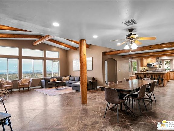 HILLTOP RETREAT on more than 5 acres in Yucca Valley. A private drive leads to this striking architectural property with panoramic views over The Mesa and Flamingo Heights. The private pool and spa with waterfall sparkle by day and come alive at night under the desert stars. Inside, beamed and vaulted ceilings crown the main living areas, where living, dining, and the gourmet kitchen flow seamlessly together. Polished concrete floors add style, while walls of glass showcase endless views. The kitchen is designed for entertaining with two side by side islands, counter seating, and a breakfast area. The primary ensuite features dual walk in closets, a fireplace, dual vanities, separate tub and shower, and direct access to a private patio. Two guest bedrooms each enjoy their own full bath, and a utility room sits along the central hall. Additional highlights include garage parking for three cars, abundant guest parking, and RV parking. The home has also enjoyed a successful vacation rental history, appealing to both investors and part time residents, and is just minutes from Pioneertown, Joshua Tree National Park, and the best of Yucca Valley, combining privacy, views, and desert lifestyle in one remarkable package.