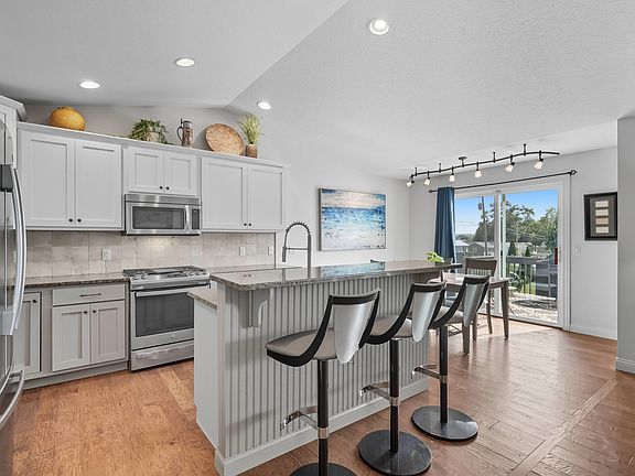 Cozy fireplaceFinished basementLarge rec roomFull barVaulted ceilingsEngineered hardwood floorsUpdated kitchen