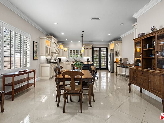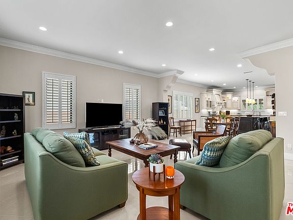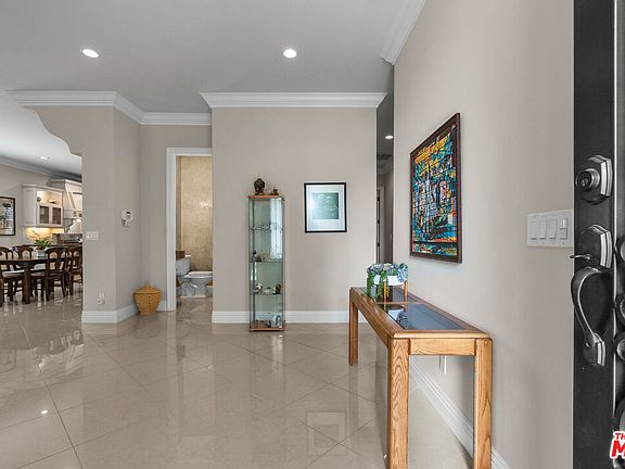 Exquisite Contemporary Mediterranean in Encino Village. Rebuilt in 2013, this warm Mediterranean single-story home with contemporary elements showcases exceptional craftsmanship and design. A dramatic iron double-door entry with laminated glass opens to soaring 10-foot ceilings and light-filled living spaces. The formal living and dining areas are accented by a picture-perfect bay window and elegant polished porcelain floors that extend throughout the main rooms. The spacious chef's kitchen is a true centerpiece, featuring custom antique white glazed cabinetry, Caesarstone countertops, stainless steel appliances, and a striking maple espresso center island with pendant lighting. This residence offers a sleeping wing with 4 bedrooms and 2.5 baths, including a romantic primary suite with a walk-in closet and spa-inspired bath complete with jet soaking tub, glass-enclosed shower, dual vanities, and porcelain floors enhanced by Venetian plaster finishes. Designer details abound, including custom paint, Venetian plaster walls in the baths, 7" crown moldings, recessed lighting, engineered wood flooring and precast concrete trim framing the entry and windows. A rare find in prime Encino, the property also includes a two-car garage; a feature seldom found in this neighborhood, with entry to the backyard, a rear covered patio provides shade and comfort, overlooking a grassy backyard framed by colorful landscaping, perfect for entertaining or relaxing in a private, serene setting. Ideally located near parks, golf courses, top rated schools, Encino Sports Center, Ventura Boulevard's restaurants and vibrant shops, Trader Joe's, and easy access to the 101 and 405 freeways. Blending timeless Mediterranean warmth with sleek contemporary touches, this home is an elegant retreat.