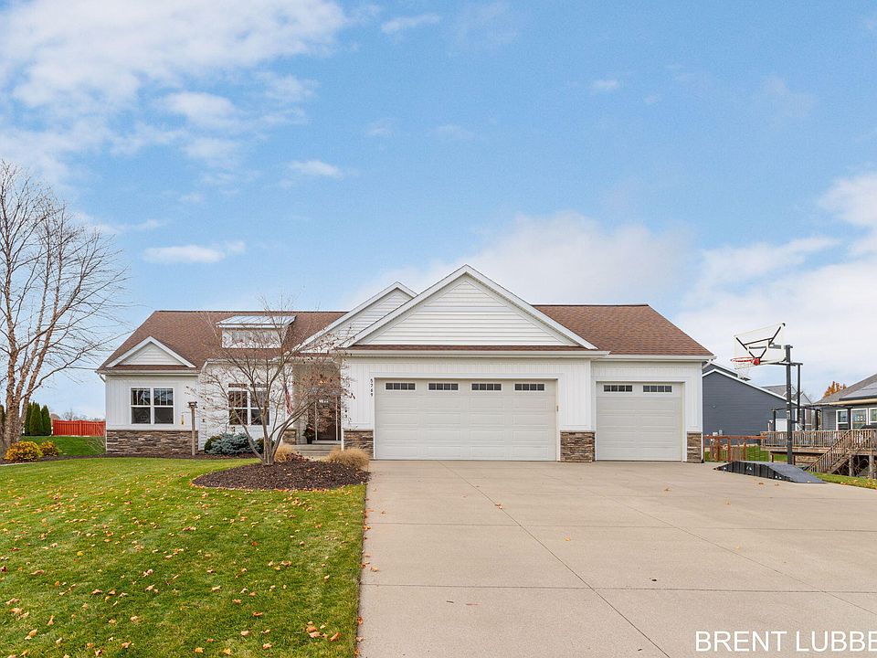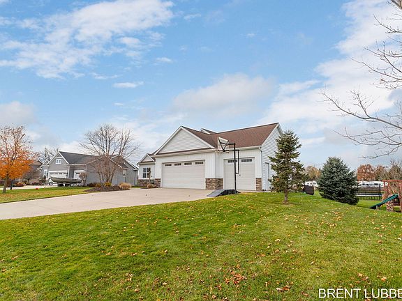 Experience exceptional space and comfort in this impressive Hudsonville ranch, set on large lot in the desirable Cory Estates neighborhood. This expansive 5-bedroom, 3.5-bath home features soaring 9-foot ceilings on both levels, creating a bright, open atmosphere throughout.The main level showcases elegant LVP flooring and a generous living area centered around a striking stone gas fireplace. The kitchen offers solid-surface countertops, a bar-height center island, stainless steel appliances, and a walk-in pantry. Custom transom windows with premium coverings and built-in home audio elevate the entire space.Retreat to the luxurious primary suite, complete with a double vanity and an oversized walk-in closet. Thoughtful touches continue with custom shelving in the bedroom closets, a spacious laundry room with additional cabinetry, and convenient lockers off the entry from the 3-stall garage. The expansive lower level extends the living space with two additional bedrooms, a full bath, a large family room, generous storage, and room to add a future bedroom if desired.