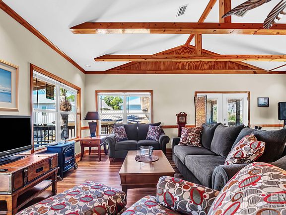 Rare double lot with water views in Bear Point Estates! This beautifully renovated 4-bedroom, 2.5-bath custom home offers approx. 1,800 sq. ft. of living space plus a 200 sq. ft. finished lower-level flex area with its own half bath and laundry—ideal as a game room, guest space, or private studio. Originally built in 1971 and expanded in 2002, the home features tranquil water views from the back deck swing, mature palms, lush landscaping, and outdoor amenities including a fish cleaning station, outdoor shower, stormwater sump pump, and decorative lighting. Inside, enjoy a remodeled kitchen, updated flooring, durable metal roof, and HVAC systems replaced within the last four years. All appliances convey. Residents can opt into the POA for just $300/year, gaining access to a private beach, boat launch, fishing piers, pavilion, and playground. With low utility costs, a transferable termite bond, and close proximity to marinas, dining, and the Gulf, this property is perfect for investors, second-home buyers, or full-time residents. Buyer to verify all information during due diligence.