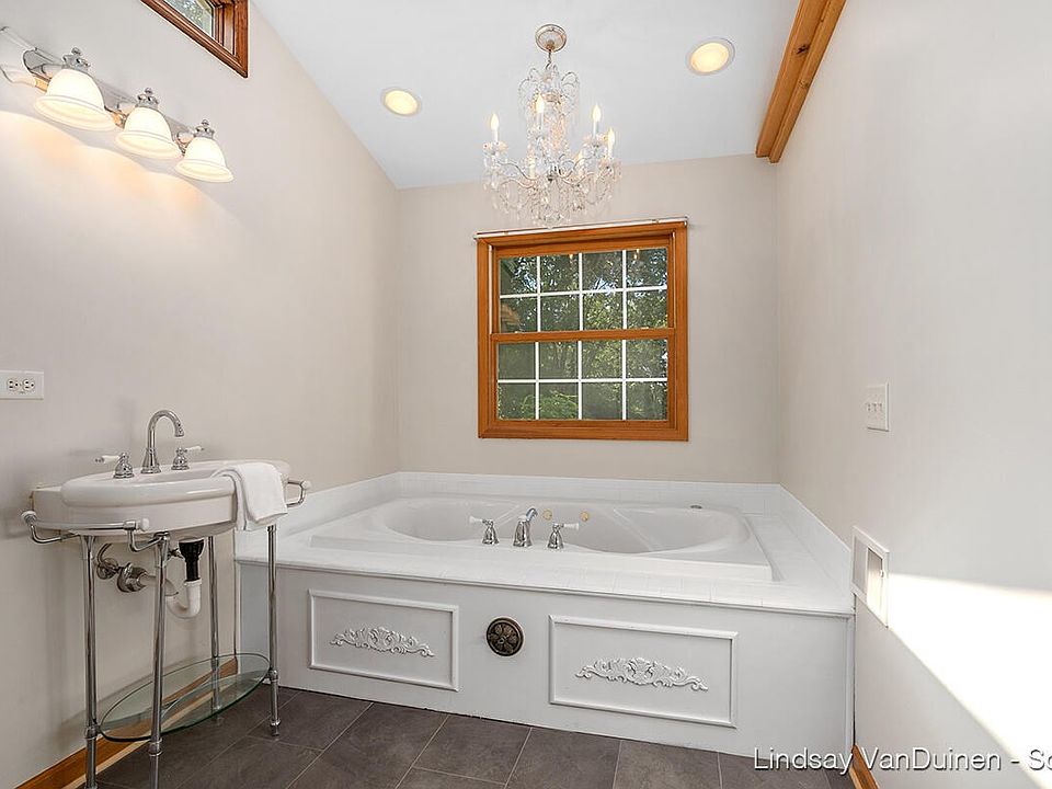 Searching for a private stately colonial home on .87 acres and just minutes from downtown ada with Forest Hills Central schools? Your search ends here! This charming home featuring 4300 sq. ft with 4-5 beds & 4.5 baths will capture your heart the moment you pull in the drive. You will immediately fall in love with the stately entrance showcasing the front porch and upper veranda. As you walk through the front door you are greeted by a small seating area/library with beautiful wood burning fireplace and custom built cherry shelving. The expansive main floor is sure to impress with the formal dining room, extra-large living room, play/game room area with built in cabinetry, sun room, & eat in kitchen. The kitchen was just recently updated with granite countertops, updated cabinetry and new
