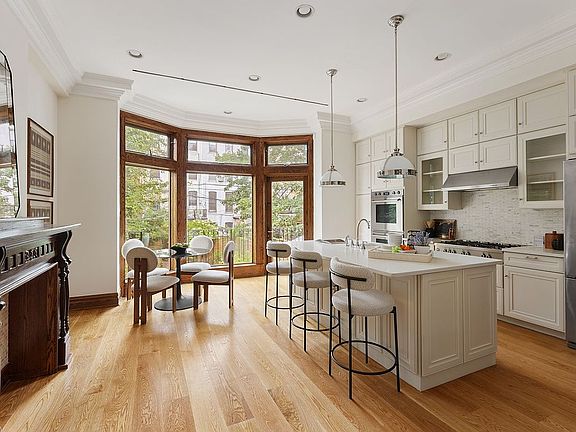 Step inside to find soaring ceilings on every floor, wide plank white oak floors, and intricate millwork, from pocket doors and carved mantels to the original staircase and decorative mirrors. Sunlight pours in through oversized bay windows, illuminating the parlor level's open layout. The chef's kitchen is a showpiece, featuring a generous center island, custom European cabinetry, a wine cooler, and a full suite of stainless steel appliances. Floor-to-ceiling windows and doors extend the living space seamlessly to the terrace and landscaped garden.