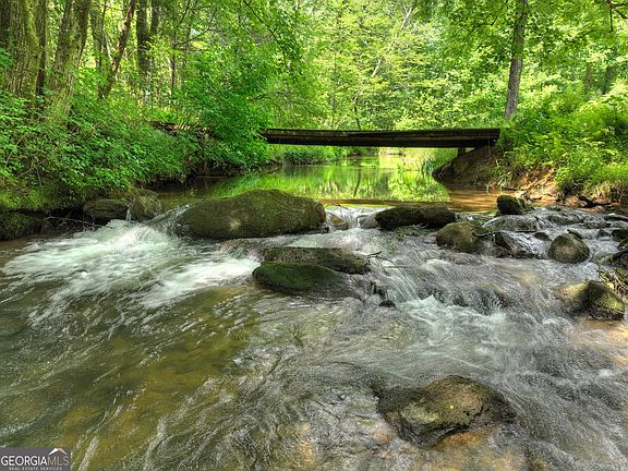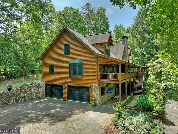 Welcome to a grand mountain retreat that captures the essence of refined rustic living just minutes from Downtown Blue Ridge and McCaysville. This sprawling timber log and stone lodge sits on a gated estate with unmatched creek frontage, scenic treeline canopy views, and roaring Patterson Creek. At its heart, a massive great room boasts soaring cathedral ceilings, exposed beams, and a commanding stone fireplace, complemented by warm wood interiors, custom millwork, and rich natural finishes. Recently renovated, the lodge features a reimagined basement level, brand-new bathrooms, and a gourmet kitchen with custom cabinetry, hand-selected stone countertops, and stainless appliances, while the HVAC system and hot water heaters have been replaced for peace of mind. Thoughtfully designed for multigenerational living, the home offers four bedrooms, a bunk room, four bathrooms, dual primary suites-one accessed by a full residential elevator-plus multiple media rooms, a large mud/laundry room, and a terrace-level den with attached two-car garage. Accessibility is enhanced with wide entryways and a wheelchair ramp, and pet lovers will appreciate the dog wash station and fenced, gated grounds for furry friends. With sleeping accommodations for 14+, the property is ideal as a private retreat or luxury vacation rental. Outside, Patterson Creek winds around the lush mountain laurel peninsula and along the northern boundary, its thunderous flow enjoyed from expansive porches. Select furnishings may remain, offering a rare opportunity to embrace elevated mountain living in this unique lodge retreat.
