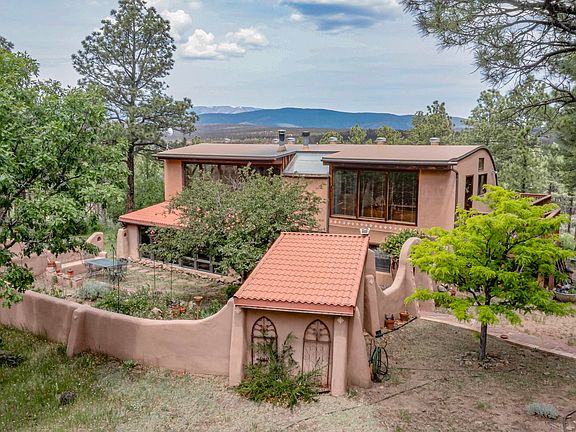 A picturesque Spanish courtyard entry complete with flower garden and Fireplace, invites you and your guests to grab a beverage, take a seat and enjoy the cool breeze before getting settled into your enchanting retreat. Secluded in the Sangre de Cristo mountain range. This Unique home offers 3 bedrooms, 2 bathrooms, and 12+ acres of outside space to create, grow and play with. There's a detached 320 sq ft casita/studio with covered parking area. 109 sq ft Storage shed/workshop has power running to it. You just have to see this one for yourself, Plenty of homestead/ family compound/ vacation getaway, possibilities here.