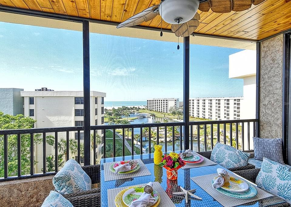 Gorgeous, TOP 7th FLOOR END UNIT in GULF AND BAY CLUB, fully renovated & furnished BEACH CONDO with full-on GULF of MEXICO views and 800’ of Siesta Key cool quartz sand private beach. A bird’s eye view to OVERLOOK IT ALL AND SENSATIONAL SUNSET VIEWS! When you enter, you capture the crystal blue GULF waters ahead and ZEN feel all around! High-end cabinetry & MARBLE FLOORS THROUGHOUT w/handsome wood trim and upscale finishes that will delight your eyes. Elegant granite & glass backsplash with a touch of glimmer, king primary ensuite with dual sinks, walk in shower, linen closet & a walk-in closet. Ceiling fans, coastal lighting & decor. 2nd bedroom offers two cozy full beds and is next to guest bath. In-unit full size Laundry ROOM, 2 secure closets. This property is turnkey furnished* and ready for you to unpack your bags and relax on your screened balcony with a cool drink. Mechanicals updated-nothing left to do! Incredible views looking East, South & West incl SUNRISE, SUNSET, MOON, pristine G&B AMENITIES, and even The City of Sarasota skyline! Gulf & Bay is A TROPICAL PARADISE community offering 32 acres of appealing amenities including 3 pools, pickleball, fitness center, spa, sauna, tennis, shuffleboard, racquetball, billiards, outdoor grilling areas and picnic spots on a fountain lighted lagoon and includes 24-hour security, e-charging station, clubs, activities and MORE. Investor friendly. Siesta Key and Sarasota offer fabulous theater, arts, culinary and cultural experiences. (*excludes 2 personal items) Don't wait on this MUST SEE TOP FLOOR END UNIT! It's priced to sell.