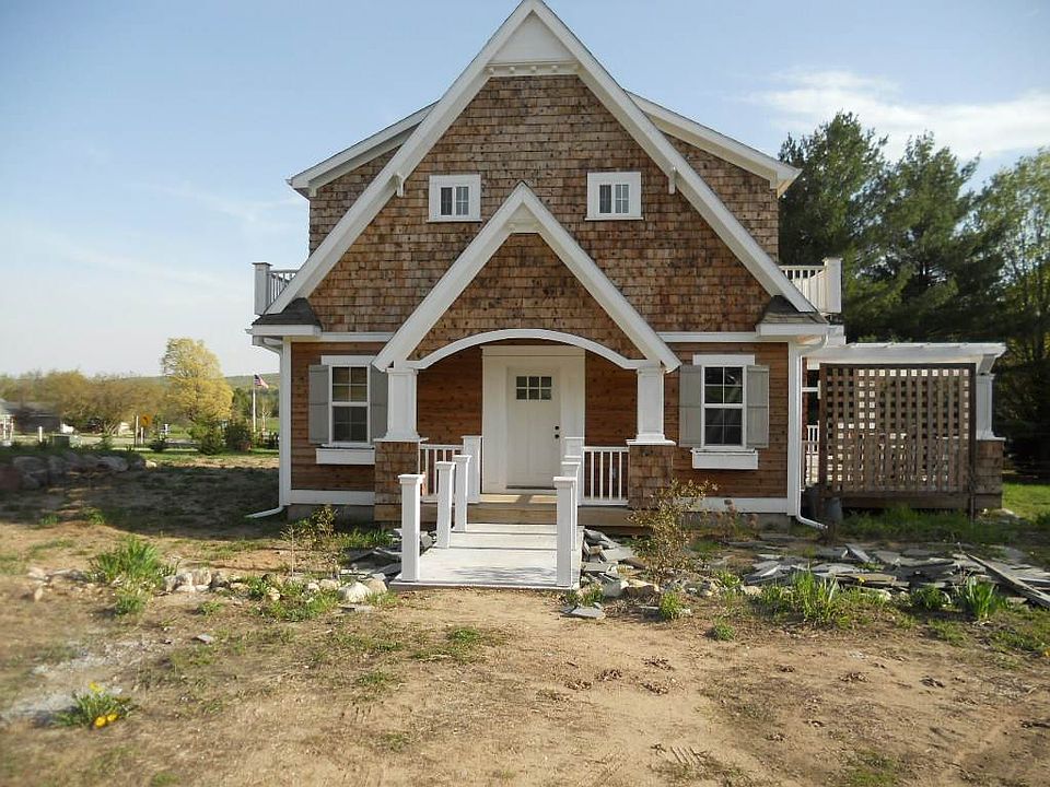 The exterior of this house is 90% completed with great detail. Interior is roughed in. Electrical rough in has been inspected. Rough in plumbing is started. A 2 bedroom, 2 12 bath home with fireplace and 3 decks..