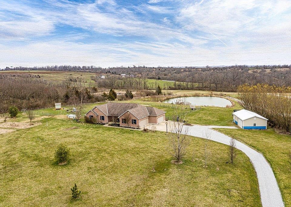 Lovely all brick ranch with 4 Bed/3 Full Bath sitting on 5.5 acres. This home has it all...4 Car attached side entry garage, Pole barn w/electric, 1/2 acre stocked pond w/dock. Great room has cathedral ceiling & cozy fire place. Hand scraped hardwood floors, Large eat-in kitchen features double oven & island. Fenced lot perfect for mini farm.