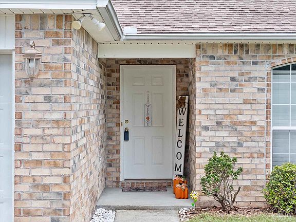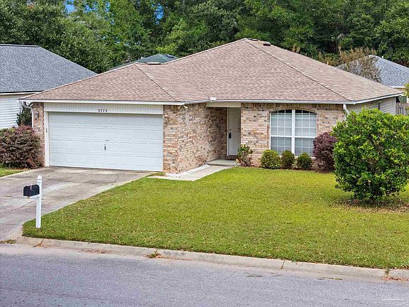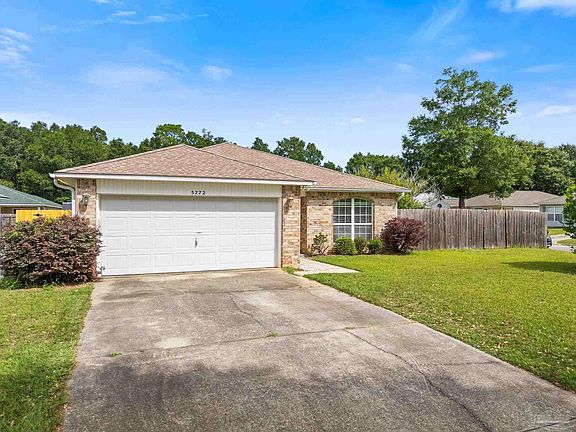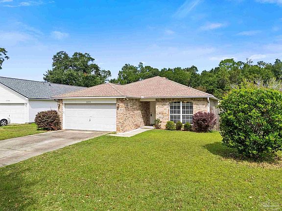 Don’t miss this beautiful 3-bedroom, 2-bath home with a 2-car garage on an oversized corner lot in the sought-after Pace School District! This well-maintained brick-front home offers a spacious open floor plan with vaulted ceilings and tile flooring in the main living areas. The wide foyer opens to a large great room that flows seamlessly into the kitchen, where you'll find a wrap-around counter with breakfast bar seating, stainless steel appliances, a generous pantry, and space for a formal dining table. The split floor plan features two guest bedrooms and a full guest bath conveniently located off the great room. The master suite includes an oversized walk-in closet, dual vanities, and a tub/shower combo with a sliding glass door. Hardwood laminate flooring runs through all the bedrooms, and both bathrooms are finished with tile floors. Additional features include aluminum hurricane shutters (valued at $1,000), updated lighting fixtures, keyless garage entry, pull-down attic stairs in the garage and installed gutters. Step outside to a covered patio accented with paver stones, a fully fenced backyard and a double-wide gate—ideal for storing a boat or RV. At approximately 1,350 square feet, this home feels much larger thanks to its thoughtful layout and abundant storage. With its prime location, spacious lot, and move-in-ready condition, this gem won’t last long!