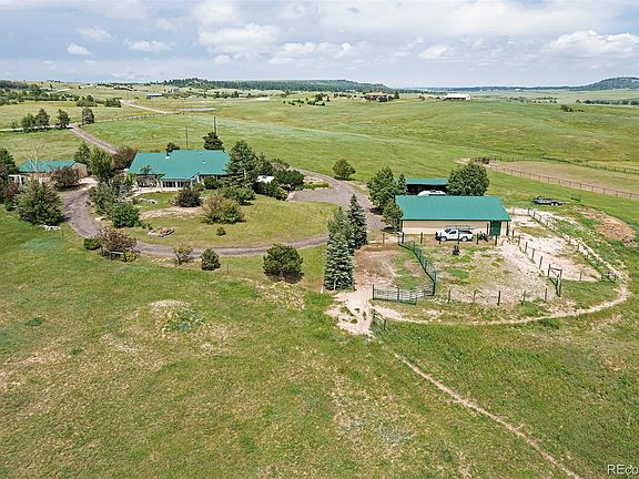 Conveniently located between Denver and Colorado Springs*Close to the interstate, yet private seclusion*5 minutes from Lincoln Mountain open space for hiking and riding*10 minutes to Spruce Mountain and Greenland open space*This 35 acre property is perfect for horses, livestock, pets, etc ...*Great curb appeal and and lots of beautiful outdoor living spaces which include beautiful sunroom and large flagstone patio*Phenomenal all pipe arena that will accommodate any and all Western or English disciplines (good footing, just needs to be worked)*40x50 barn with new siding*Equipment loafing shed*24x30 detached garage/workshop with partitioned areas*Family room has vaulted ceilings and wood burning stove*Interior shows clean and bright*Upgraded kitchen and baths*Some new windows*Upgraded electrical panel and much more! It's now priced to sell!