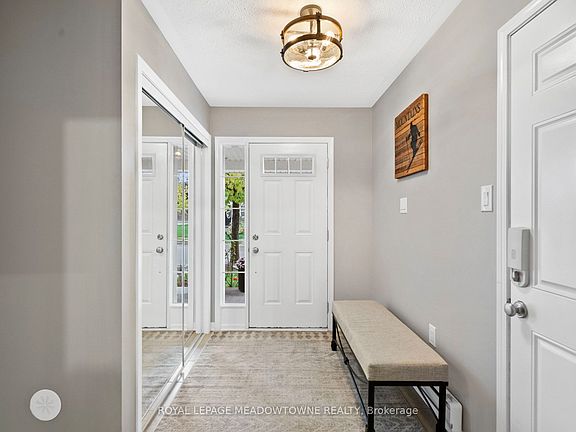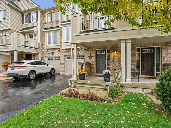 Freehold townhome (no condo fees) on a quiet street. 1,195 sq.ft. Currant model by Mattamy. Upgraded flooring & piano-style stairs with white risers and wood treads. Refreshed powder room. Open concept kitchen with lots of counter space + extra pantry, overlooking living & dining. Western exposure for evening sun. Two full baths upstairs, walk-in closet, landing ideal for office setup. Storage in lower level. Steps to trail & picnic spot, near Milton Community Park. Parking for 3 (2 driveway + garage).