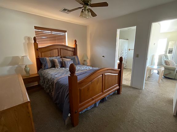 This property is a one bedroom, one bathroom upstairs apartment ready for someone to make it their new home. Apartment includes garage parking, shared laundry, large patio with patio furniture and a BBQ. Views of the mountains in Laughlin while enjoying the comforts of your patio. Apartment has a kitchen with views of the patio and mountains in the distance, bar counter top for dining, living room, bathroom with doors from the bedroom as well as the living space for guests, sit down vanity in the bathroom, and a day bed near the entrance for guests or a comfortable reading nook.