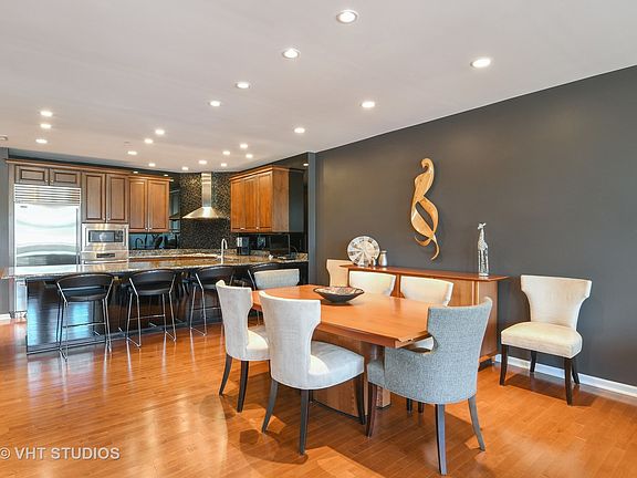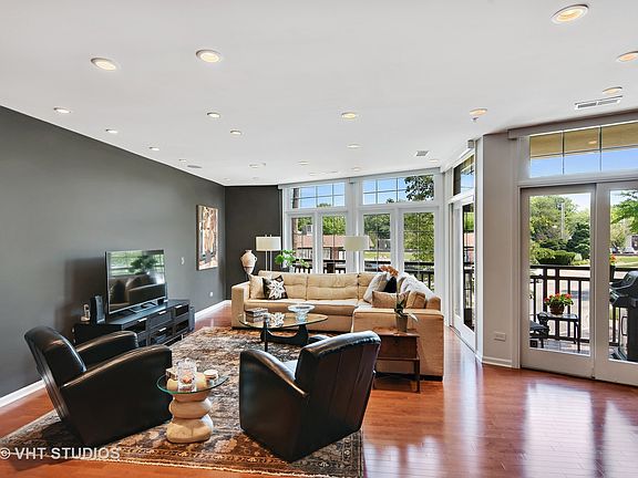 Gracious contemporary condo that lives like a home but without the work. Open kitchen and floor plan for great entertaining. Top of the line stainless appliances, granite counters, 42" cabinets, fabulous pantry. Wood flooring throughout. Large laundry room; amazing storage. Two bedrooms plus den/office. Two full baths; master with spa tub. Balcony overlooking park in the heart of Ravinia. Two parking spaces and double storage in garage. Low maintenance fees include gas, water, garbage and landscaping. Nothing to do but enjoy! Agent owned.