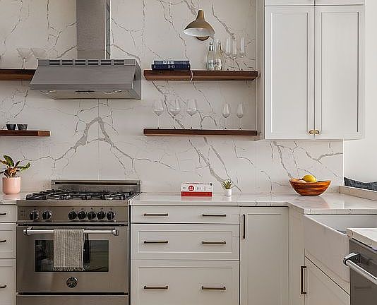 The serene primary suite includes a generous walk-in closet and a spa-inspired bath with imported Pietra Grey marble, White Lux porcelain, and satin-nickel fixtures.