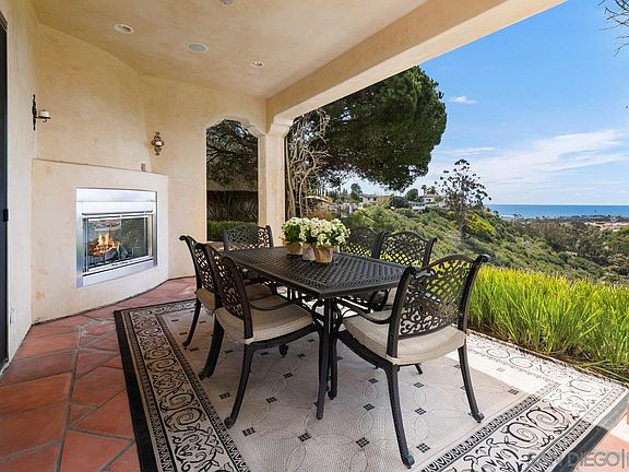 Offering panoramic ocean and canyon views in a private and gated Mediterranean villa. Features 4 fireplaces, 3 car garage, enclosed courtyard with fountain and security gate; gourmet kitchen with stainless steel GE Monogram appliances; 10' ceilings and 8' hand hewn doors; copper rain gutters; zoned air conditioning and wood paneled elevator access to second floor. Great family floor plan with all bedrooms and laundry room on the second floor. Not to be missed. Superbly built residence has 4 spacious bedrooms, 3 bathrooms, and the laundry room conveniently located on the 2nd floor, with wood paneled elevator providing easy access. Master retreat includes a Sea View Terrace with white water views, fireplace and two walk-in closets. Master Bath is generously sized with travertine walls and floors and granite countertops , an oversized shower and "Ultra Bath" tub. Home includes 4 fireplaces, travertine flooring, and hand hewn wood flooring in the main salon. "Smart Home" technology wired for low voltage/home system/security high-tech wiring throughout, and includes 3 security cameras with wiring available for additional units. HD 50" Plasma TV in family room. Chef's kitchen with GE Monogram stainless steel appliances includes 8 burner range, wine cooler, wall ovens, warming drawer and more. 10' ceilings and 8' hand hewn doors; two zone AC; and South facing central courtyard. "Forever" ocean and canyon views. Close to schools, parks and easy freeway access. Equipment: Fi