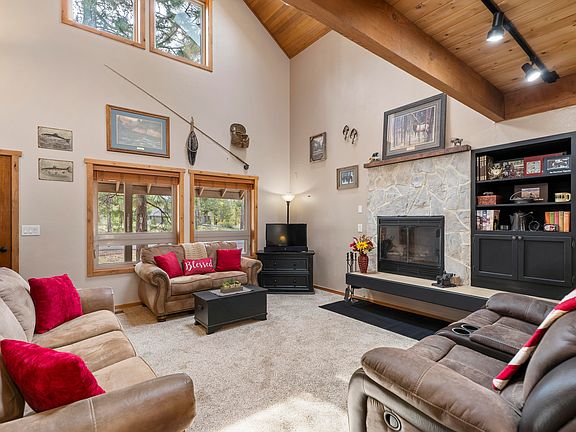 Tucked among the pines, this Sunriver cabin blends classic charm with fresh, modern upgrades. The vaulted great room welcomes you with warm wood accents, exposed beams, and a cozy wood-burning fireplace. Large windows fill the space with natural light, flowing into the beautifully updated 2025 kitchen featuring quartz counters, stainless appliances, luxury vinyl plank flooring, and a large island with eating bar—perfect for casual dining and entertaining. The main level offers two bedrooms, a full bath, and laundry, while upstairs includes a guest room with storage under the eaves and a spacious primary suite with private deck access. Enjoy the outdoors on the Trex front porch or rear deck - or relax in the hot tub enclosure, surrounded by serene natural beauty. Additional 2025 updates include a new furnace and A/C & exterior paint. SHARC paid. It is conveniently located near the Cottonwood entrance, grocery store, gas station, and Sunriver's new community dog park.