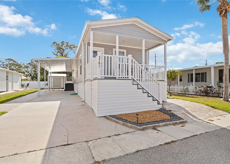 MOTIVATED SELLER!! Discover this charming 2-bedroom, 2-bathroom manufactured home at 5781 Orange Blossom Rd, nestled in the desirable 55+ community of Japanese Gardens in Venice, Florida. Built in 2023 to Wind Zone III standards, this home offers modern comforts and durability. Inside washer and dryer!! The open floor plan is perfect for entertaining, featuring a well-appointed kitchen with ample cabinetry and a convenient breakfast bar. Both bedrooms offer spacious closets, with the master suite boasting an en-suite bathroom for added privacy. Stylish vinyl plank flooring runs throughout the home, providing both aesthetic appeal and easy maintenance. Enjoy outdoor living with a west-facing front porch, perfect for watching sunsets, and a beautifully designed backyard with a brick paver patio, seating area, BBQ grill, umbrella, lighting, and multiple electrical outlets. A large shed offers additional storage, and a brand new carport is installed. This fully furnished, move-in-ready home is just 2 miles from Manasota Beach, with access to fantastic community amenities, including a clubhouse, heated pool, pickleball and shuffleboard courts, and a spa/hot tub. The affordable monthly HOA fee of $254 covers cable TV, community pool maintenance, sewer, and water. Experience the best of coastal living in this vibrant, pet-friendly community—schedule your showing today!