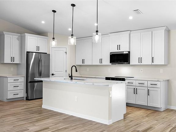 BRAND NEW -COMPLETED AND MOVE IN READY HOME. You'll fall in love with this beautifully crafted CUSTOM MODERN 3 bedroom, 2 full bathrooms home where nothing was overlooked in designing and finishing this home. The home features a bright open floor plan with Vaulted Ceilings that soar to over 10 feet high in the main living area. It's perfect for entertaining. PORCELAIN TILE THROUGHOUT the entire house provides a soothing flow that every homeowner desires. The gourmet chef’s kitchen is a dream that has custom two tone 42" SOLID WOOD SHAKER CABINETRY, QUARTZ countertops with an oversized island, UPGRADED PREMIUM STAINLESS STEEL APPLIANCES, and a walk-in pantry. The large Master bedroom includes a tray ceiling, ample natural light, led lights and designer ceiling fan. The Breathtaking en-suite master bath greets you with large format tile in the walk-in shower, Quartz counters with dual sinks are highlighted with designer mirrors and lighting. This Energy efficient home has HEAVY DUTY HURRICANE IMPACT WINDOWS AND SLIDER, UPGRADED 4" LED RECESSED LIGHTING with MODERN DESIGNER LED lighting fixtures and ceiling fans through out. Featuring European style pavers in the driveway and in the oversized covered patio lanai. Irrigation system is included in both front and back lawns. Builder provides the homeowner a peace of mind with a 1 year builder warranty. Prime location in growing city of North Port, close to shopping and dining, and only a short drive to the beaches! NO HOA, NO CDD! Schedule your showing today, this one is a MUST SEE!
