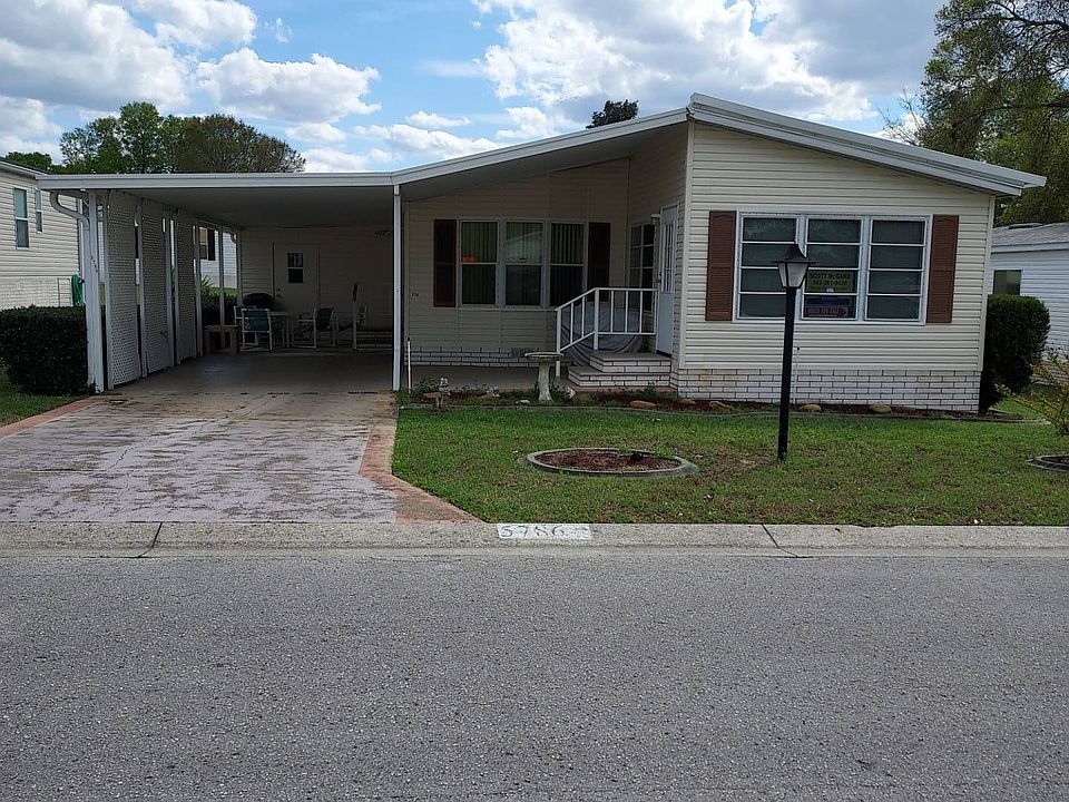 Cozy 2/2 960 sq. ft. home located in an active age restricted 55 plus community. There is a lot fee of 598.00 per month. Home has a metal roof over. Enclosed front porch. All appliances. Covered carport. Located in the heart of South West Ocala close to hospitals, restaurants, and all shopping. Amenities include clubhouse with a heated pool, hot tub, outside shower, exercise room, billiard room, library, and activity center. Dog park and dog stations throughout the community.