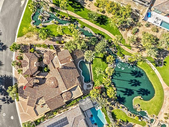 This magical Italian villa in Stone Creek was built for the developer, on the most desirable lot and upgraded throughout. Ideally located near world-class golf courses; Andalusia, PGA West, and The Madison Club to name a few --and just minutes from the Coachella venue, the property offers both exclusivity and convenience. The 4-bedroom, 5-bath layout includes a 2-room detached casita and 3,588 sq. ft. of refined living space with travertine floors, timeless granite, stainless appliances, a full bar, and a formal dining room with a beamed ceiling.The great room is highlighted by pocket sliding glass doors, custom built-ins, surround-sound, and a stone fireplace, while the primary suite features a beamed ceiling, a stone fireplace, and a luxurious bath. Outdoors, enjoy an infinity-edge pool, sunken BBQ pit, custom pergola, and a creekside setting with dramatic mountain views. Make an appointment for your own private showing today!