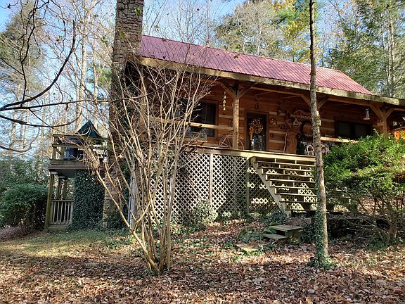Amazing custom log home! Hand hewed logs, red metal roof. Main level has 2 bedrooms and a full bathroom. Beautiful stone fireplace in the livingroom, currently has gas logs, easily converts to wood burning. Kitchen has updated stainless appliances. Upstairs has a loft with sitting area and long range views. Also the master bedroom and ensuite bathroom. Throughout this home is wide plank wood floors, Peach Tree double paned windows and sliding doors. Deck with amazing mountain views. Downstairs is a full unfinished basement. There is a finished bedroom and ensuite bathroom with separate outside entrance. Has a nice porch and Jacuzzi hot tub. This wooded 13.53 acres has privacy and views. 4 out buildings, perfect for a workshop and storage. All tastefully built to compliment the home and property. There is a 2 car carport closed on 3 sides easily made into garage. Make your mountain dream come true in this beautiful retreat. Buyers and buyers agent verify all information.